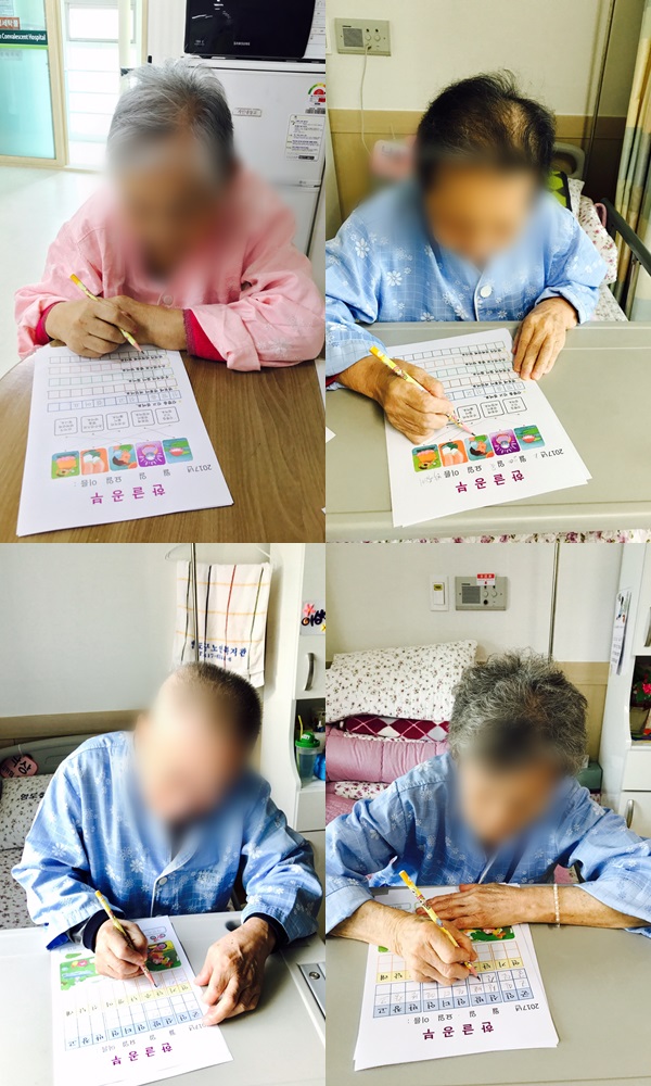인지치료 - 한글 공부 본문 2017년 4월 20일 (목) 오늘은 인지치료로 한글 공부를 하였습니다. 연필을 잡아 본 지 오래 됐다며 한글 쓰기에 자신 없어 하셨지만, 헷갈려 하시면서도 또박 또박 한 글자씩 정성스럽게 써 내려 가셨습니다^^ 이전글 목록 다음글