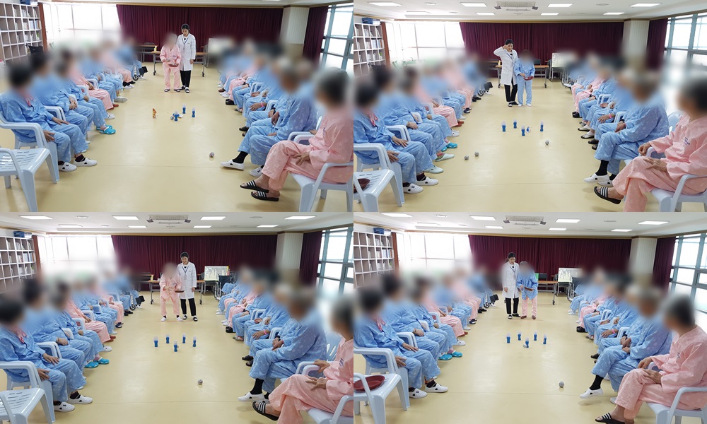 치료레크리에이션 - 동물 맞추기 본문 2017년 4월 21일 (금) 오늘은 치료레크리에이션으로 동물 맞추기를 하였습니다. 야구를 하듯, 볼링을 치듯 다양한 포즈를 취하시면 공을 던지거나 굴리셨고, 동물 캔이 빙그르르 구르면서도 넘어지지 않는 모습을 보시고는 손뼉을 치며 즐거워 하셨습니다^^ 이전글 목록 다음글