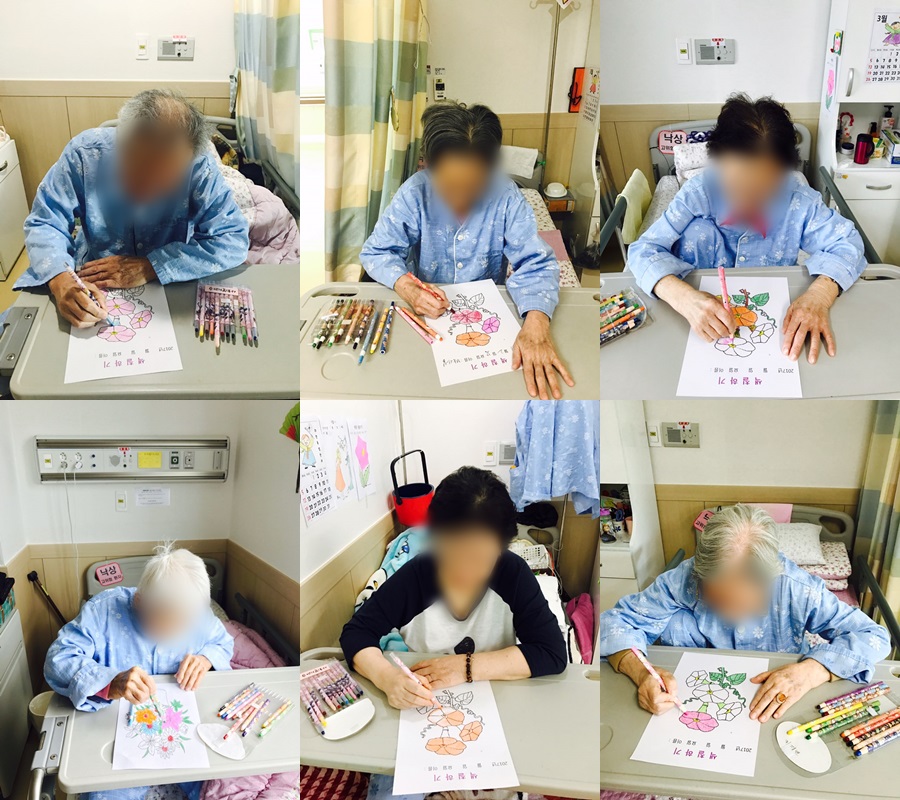 미술치료 - 색칠하기 본문 2017년 3월 2일 (목) 오늘은 미술치료로 색칠하기를 하였습니다. 예쁜 나팔꽃을 보시고는 노래를 흥얼거리시며 기분 좋은 모습으로 색칠을 완성하셨고, 완성한 그림을 들고는 자랑하시는 다른 환자분들께 보여주기도 하셨습니다^^ 이전글 목록 다음글