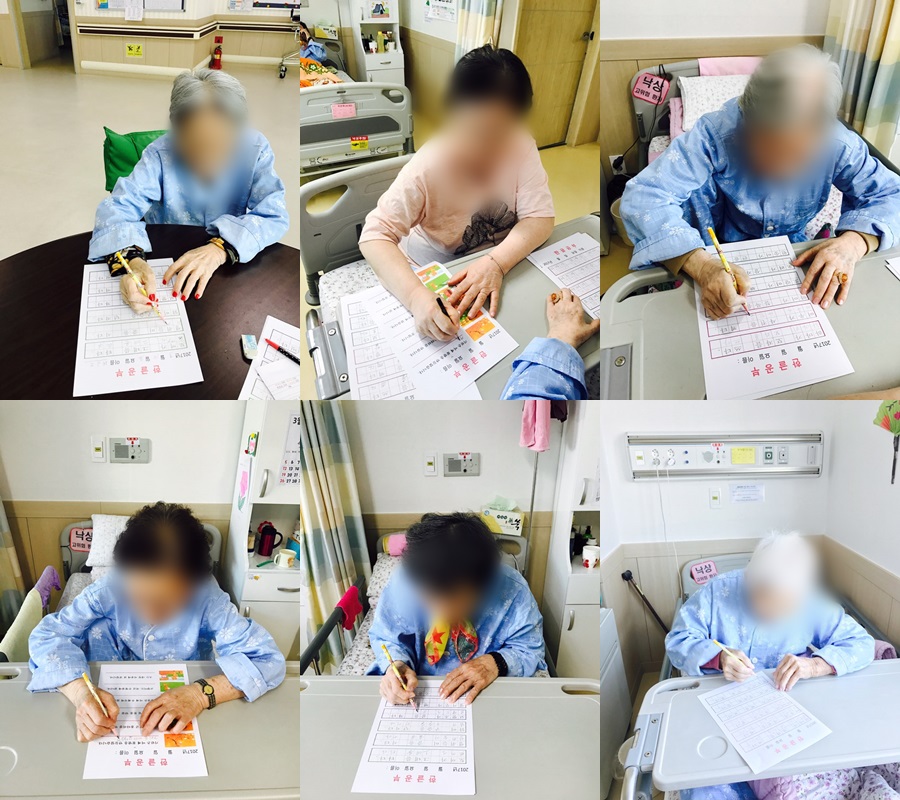 인지치료 - 한글 공부 본문 2017년 3월 10일 (금) 오늘은 인지치료로 한글 공부를 하였습니다. 참여자분들은 한글에 대해 인지를 하고 있음에도 불구하고, 한글 공부를 안하니 자꾸 잊게 된다며 집중하여 한글자씩 써내려가셨습니다^^ 이전글 목록 다음글