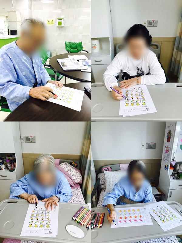인지치료 - 같은 그림 찾기 본문 2017년 2월 17일 (금) 오늘은 인지치료로 같은 그림 찾기를 하였습니다. 그림 처음부터 끝까지 자세하게 살펴보시면서 같은 그림을 잘 찾아 내셨지만, 어려운 그림은 고개를 갸우뚱 거리시며 신기한듯 바라보시며 재미있어 하셨습니다^^ 이전글 목록 다음글