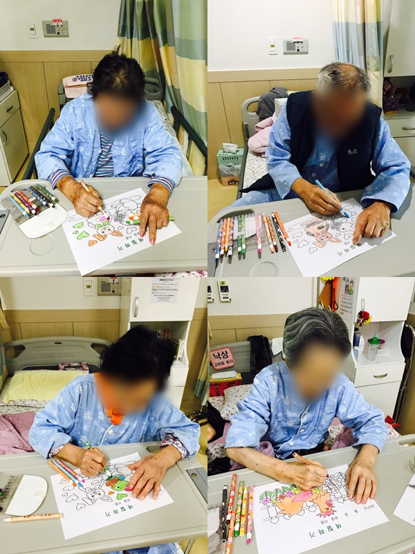 미술치료 - 색칠 하기 본문 2017년 1월 4일 오늘은 미술치료로 색칠 하기를 하였습니다. 정유년을 맞이하여 준비한 닭 그림 도안과 귀여운 토끼 그림 도안을 보시더니 귀엽고 사랑스럽다며 색칠을 하시면서도 얼굴에 웃음꽃을 피우셨습니다^^ 이전글 목록 다음글