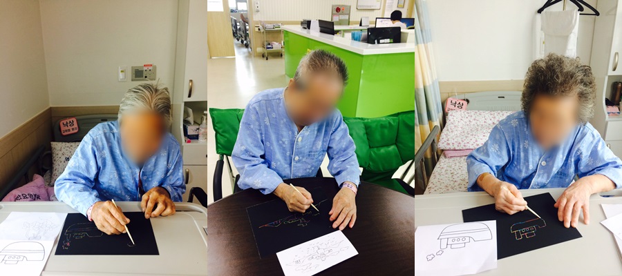 미술치료 - 스크래치 그리기 본문 2016년 12월 14일 오늘은 미술치료로 스크래치 그리기를 하였습니다. 검은 바탕에 스틱으로 그림을 그리니 알록 달록 다양하게 그려지는 그림을 보시고는 신기하다며 좋아하시면서 그림 도안을 보고 잘 따라 그리셨습니다^^ 이전글 목록 다음글