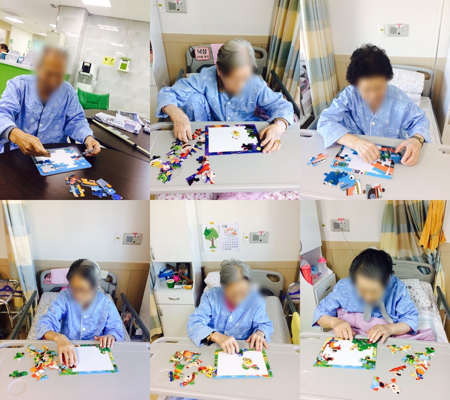 인지치료 - 퍼즐 맞추기 본문 2016년 11월 24일 오늘은 인지치료로 퍼즐 맞추기를 하였습니다. 과거 퍼즐을 잘 맞춰다고 하시면서 자신감 찬 모습으로 한 조각씩 차근차근 맞춰 퍼즐을 완성하셨고, 완성한 퍼즐을 보시고는 그림이 예쁘다며 좋아하셨습니다^^ 이전글 목록 다음글