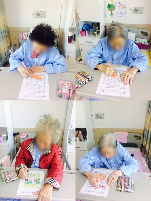 미술치료 - 같은그림 색칠하기 본문 2016년 11월 25일 오늘은 미술치료로 같은그림 색칠하기를 하였습니다. 같은 모양의 그림을 하나씩 색칠하시면서 나타나는 그림을 보시고는 처음에는 무슨그림인지 몰랐는데 색칠을 하고 보니 무슨 그림인지 알겠다며 신기해 하셨습니다^^ 이전글 목록 다음글