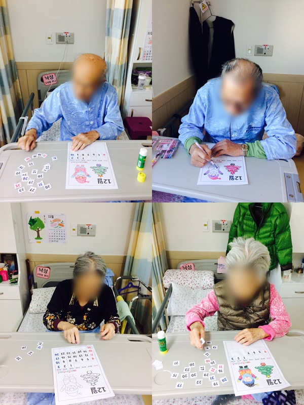 인지치료 - 12월 달력 만들기 본문 2016년 11월 28일 오늘은 인지치료로 12월 달력 만들기를 하였습니다. 달력 도안에 산타클로스와 트리를 보시고는 올해도 다 지나갔다며 아쉬움을 나타내는 분들도 계셨고, 예쁘게 색칠하여 크리스마스 기분을 내보자며 웃으시며 좋아하시는 분들도 계셨습니다^^ 이전글 목록 다음글