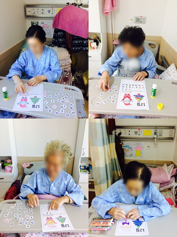 인지치료 - 12월 달력 만들기 본문 2016년 11월 29일 오늘도 인지치료로 12월 달력 만들기를 하였습니다. 색칠도 하고 달력 날짜도 꼼꼼하게 붙여야 한다며 집중을 하셨고, 산타클로스의 모습이 어땠었는지 상상하시면서 예쁘게 색칠을 하셨습니다. 이전글 목록 다음글