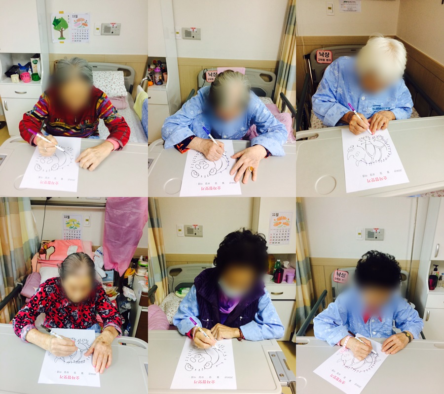 인지치료 - 숫자점 잇기 본문 2016년 11월 8일 오늘은 인지치료로 숫자점 잇기를 하였습니다. 숫자점을 이어 완성한 코뿔소, 팬더를 보시고는 돼지, 코끼리, 곰 등 다양한 동물을 말씀하셨고, 처음 본 동물이라며 신기하신듯 한참을 바라보셨다. 이전글 목록 다음글