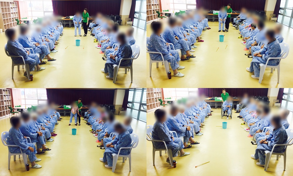 치료레크리에이션 - 투호 본문 2016년 10월 11일 오늘은 치료레크리에이션으로 투호를 하였습니다. 투호 바구니는 조금 더 가깝게 하였더니, 참여자분들도 높은 점수를 받아 좋아하시며 게임을 즐겁게참 참여하셨습니다^^ 이전글 목록 다음글