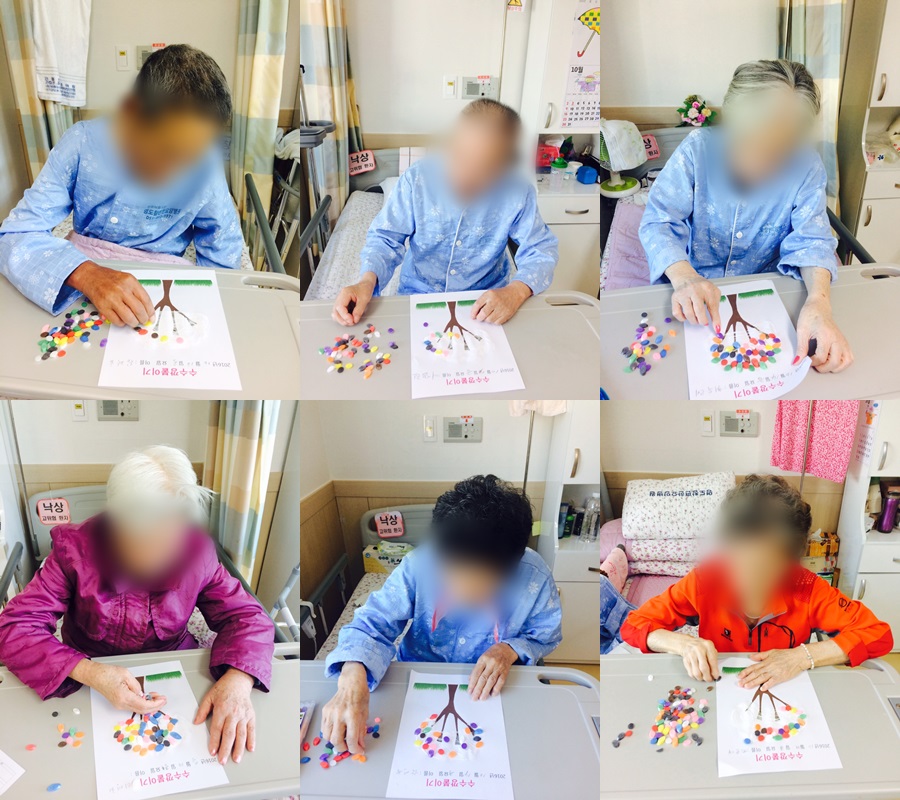 미술치료 - 수수깡 붙이기 본문 2016년 10월 14일 오늘은 미술치료로 수수깡 붙이기를 하였습니다. 수수깡을 붙이시며 열매를 맺은거 같아 예쁘다고 하셨고, 수수깡 나무를 완성하신 것을 보시고는 알록달록 예쁘다며 좋아하셨습니다^^ 이전글 목록 다음글