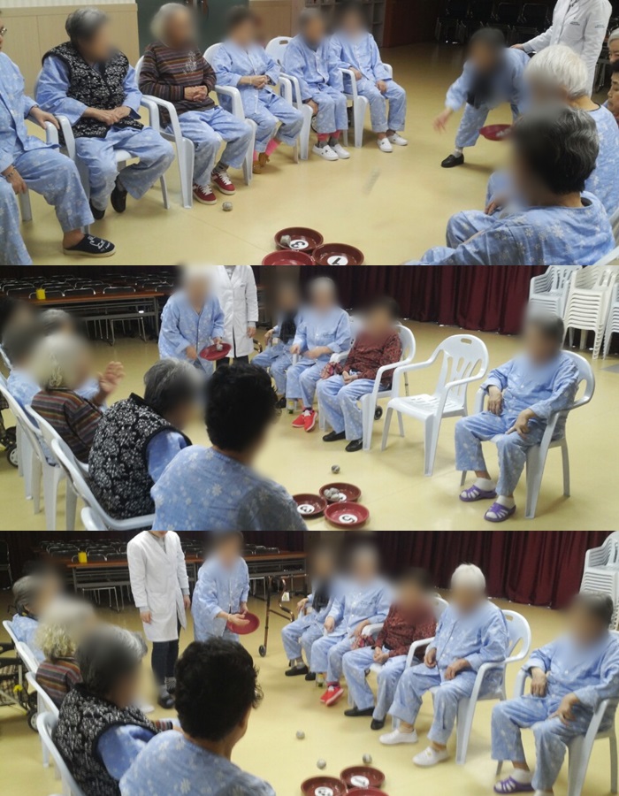 2016년 3월 14일 오늘은 치료레크리에이션으로 신문지공 던지기를 하였습니다.
