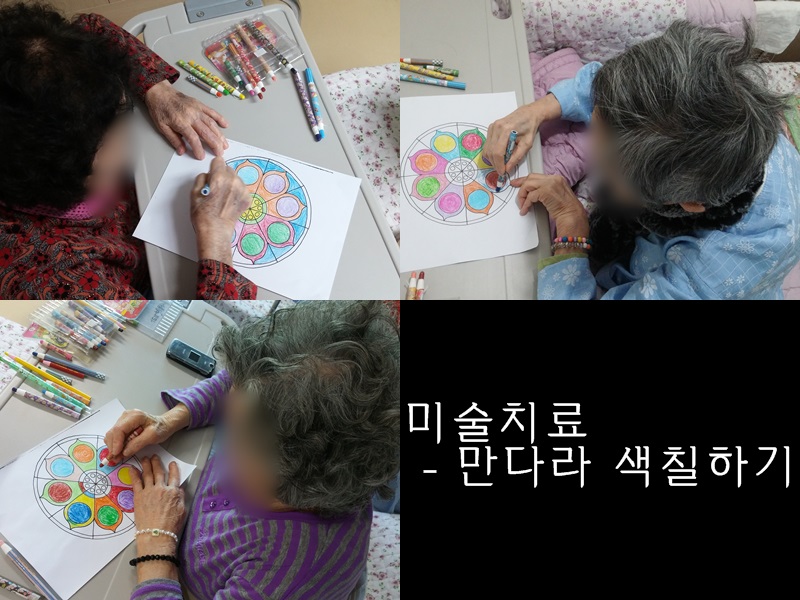 오늘은 미술치료로 만다라 색칠하기를 하였습니다~
