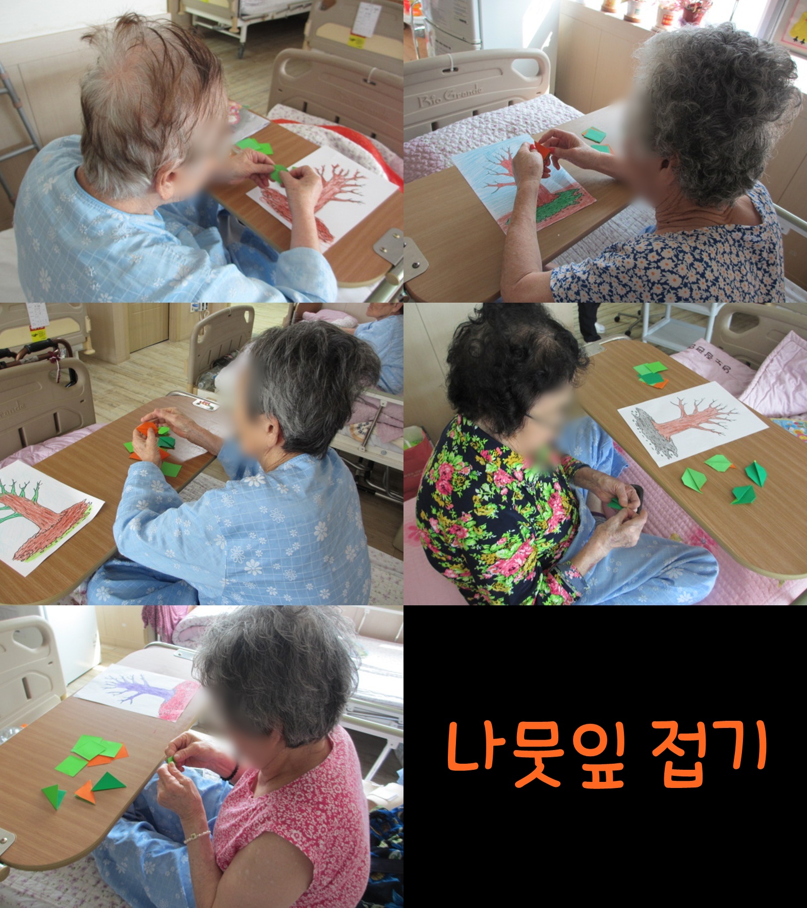 미술치료 - 나뭇잎 접기 본문 어르신들의 소근육 기능 향상 및 유지를 위해 나뭇잎 접기를 진행했습니다. 대부분의 어르신들께서 시력이 좋지 않아 모서리를 맞추어 접는 것을 어려워하셔서 조금 힘들어하셨습니다. 이전글 목록 다음글