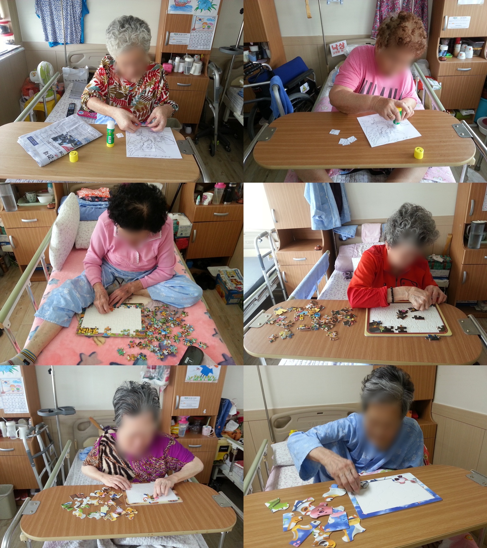 퍼즐 맞추기에서는 퍼즐을 완성하고 났을 때 어르신들이 뿌듯해하시고 만족하셨습니다. 그래서 박수를 치며 좋아하는 어르신들도 계셨답니다.