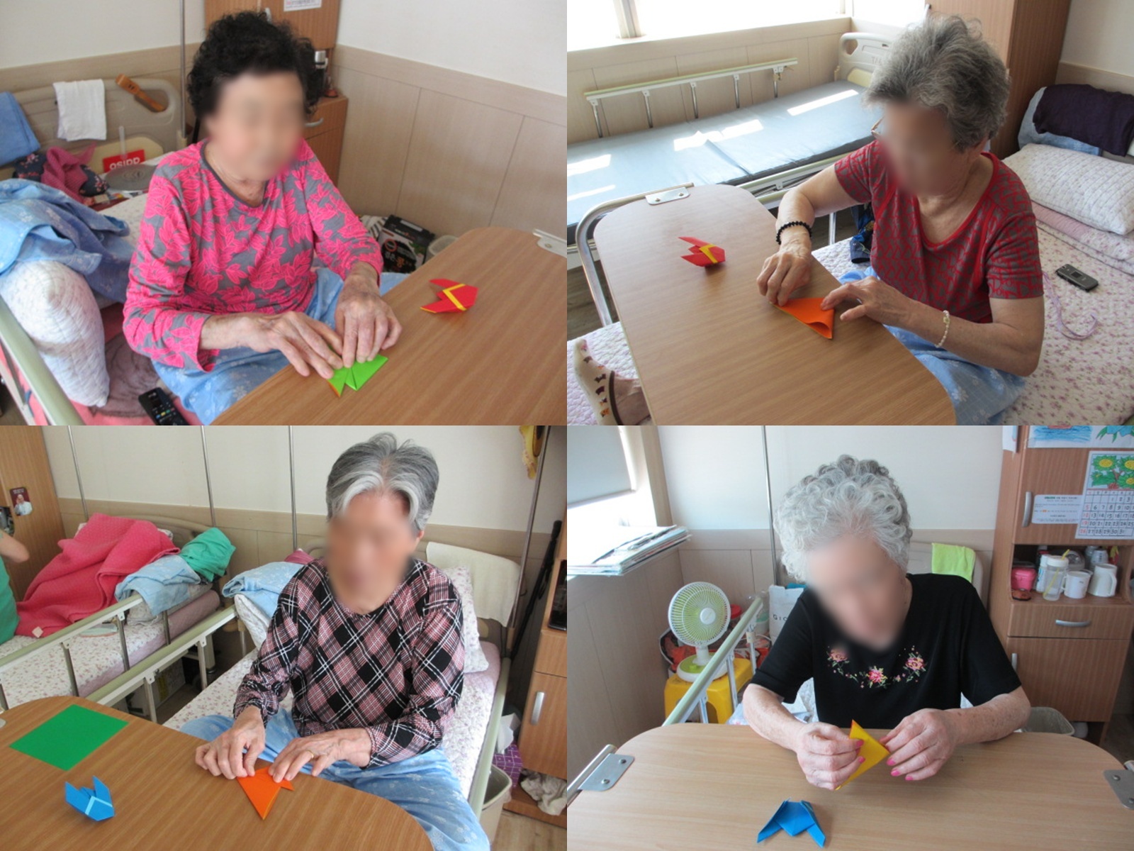 미술치료 - 매미접기 본문 여름을 맞아 매미접기를 진행했습니다~ 각자가 원하는 색깔의 매미가 나오도록 색깔을 신중히 선택하셨답니다~ 종이접기 순서를 잘 외우는 분도 있는 반면에 거의 기억하지 못하는 어르신도 있으셨지만 완성된 작품을 보시고는 만족해하셨습니다~ 이전글 목록 다음글