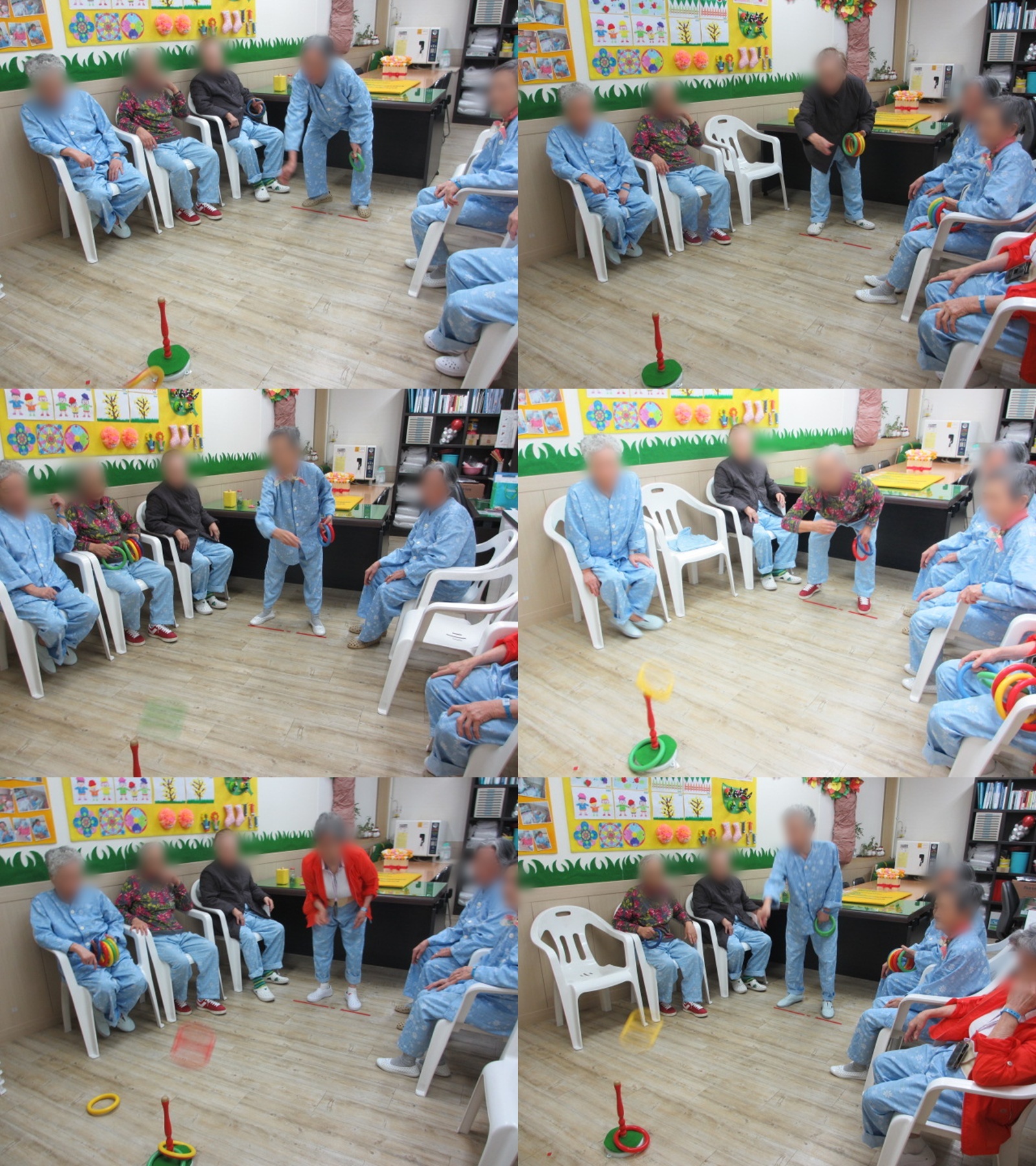 치료레크리에이션 - 고리 던지기 본문 어르신들께서 어려워하시는 게임들 중 하나인 고리 던지기를 진행했습니다~ 게임을 진행할수록 넣으시는 고리의 개수가 점점 더 많아져 어르신들께서 좋아하셨답니다~ 이전글 목록 다음글