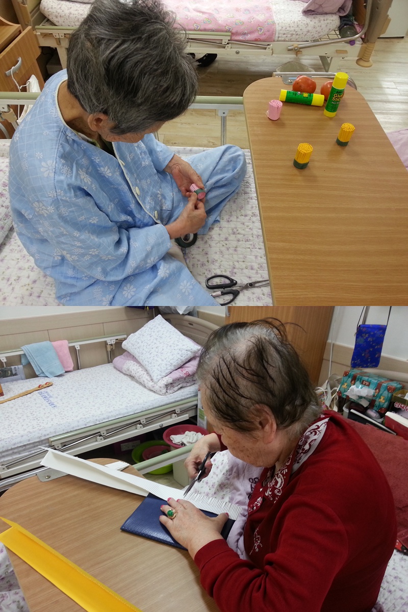 미술치료 - 국화 만들기 본문 가을의 대표적인 꽃, 국화를 만들어 보았습니다~ 국화의 꽃잎을 만드시느라 열심히 가위질을 하셔서 힘드셨다는 우리 어르신들~ 힘드셨던 만큼 완성된 국화를 보고 좋아하셨답니다~ 이전글 목록 다음글