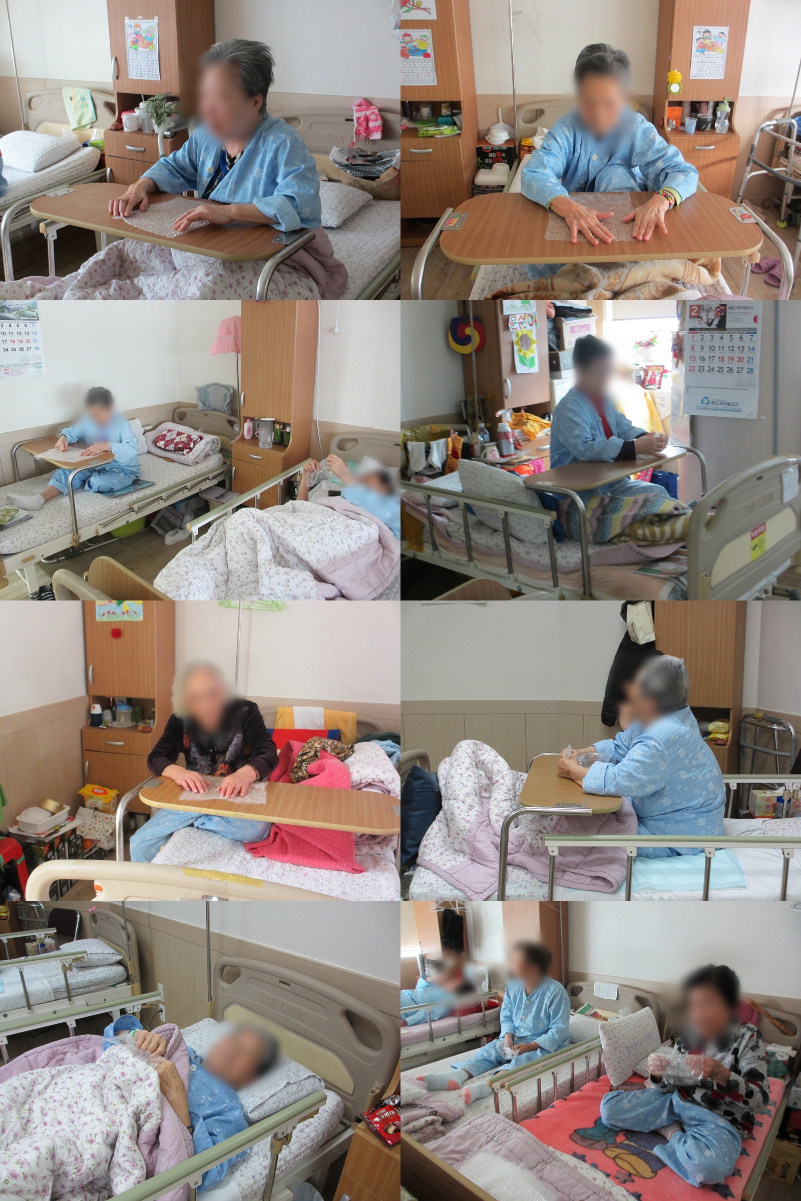 작업치료 - 에어캡 터트리기 본문 오늘 진행한 에어캡 터트리기는 어르신들께서 좋아하시는 프로그램 중 하나입니다. 에어캡을 하나씩 터트리시다보면 다른 생각을 하지 않게 되고 손가락에 힘도 생기지요. 톡톡 터지는 소리도 어르신들께서 즐거워하신답니다. 에어캡의 매력에 빠진 우리 어르신들은 다음 시간을 기다리십니다~ 이전글 목록 다음글
