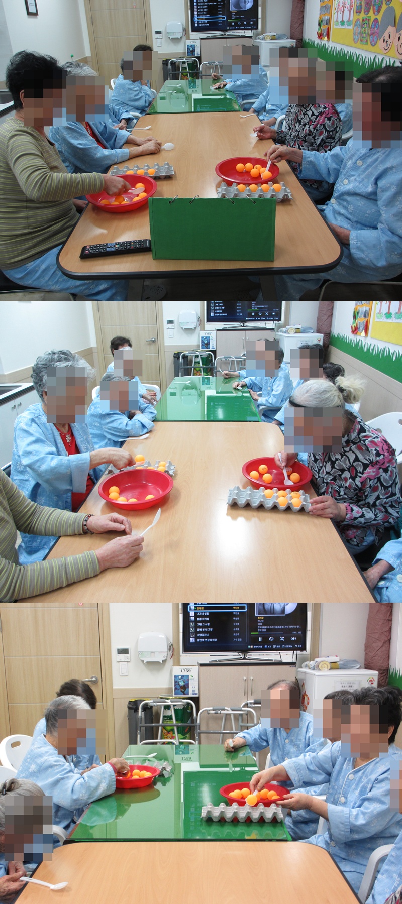 상대방보다 탁구공을 빨리 옮기기 위해 열심히 손을 움직인 어르신들입니다.