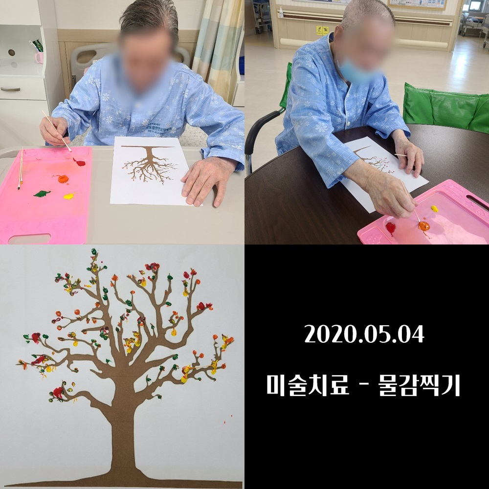 2020년 05월 04일 (월) 오늘은 미술치료로 물감찍기를 하였습니다.