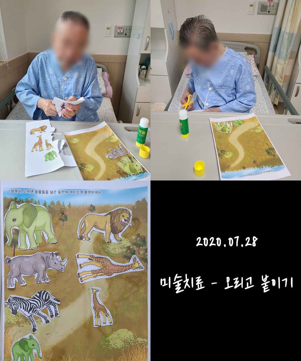 2020.07.28 미술치료 - 오리고 붙이기 본문 2020년 07월 28일 (화) 오늘은 미술치료로 오리고 붙이기를 하였습니다. 어르신들께서 직접 동물모양을 오려서 붙이며 동물원을 연상시키는 자료를 완성하셨고, 완성된 자료를 보시더니 웃음을 보이시며 재미있어하셨습니다~^.^ 이전글 목록 다음글