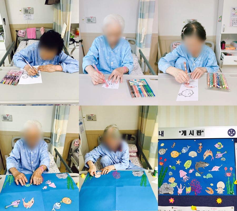 2023.03.17 집단미술치료 - 바닷 속 꾸미기 본문 2023년 3월 17일 (금) 오늘은 집단미술치료로 바닷 속 꾸미기 프로그램을 하였습니다. 어르신들 마다 여러가지 물고기들을 알록달록하게 예쁘게 꾸미시면서 어떤 물고기인지 맞추시며 색칠하기에 집중하셨습니다. 완성한 물고기를 붙이니 멋진 바닷속이 완성되었다며 박수를 치시며 좋아하셨습니다^^ 이전글 목록 다음글
