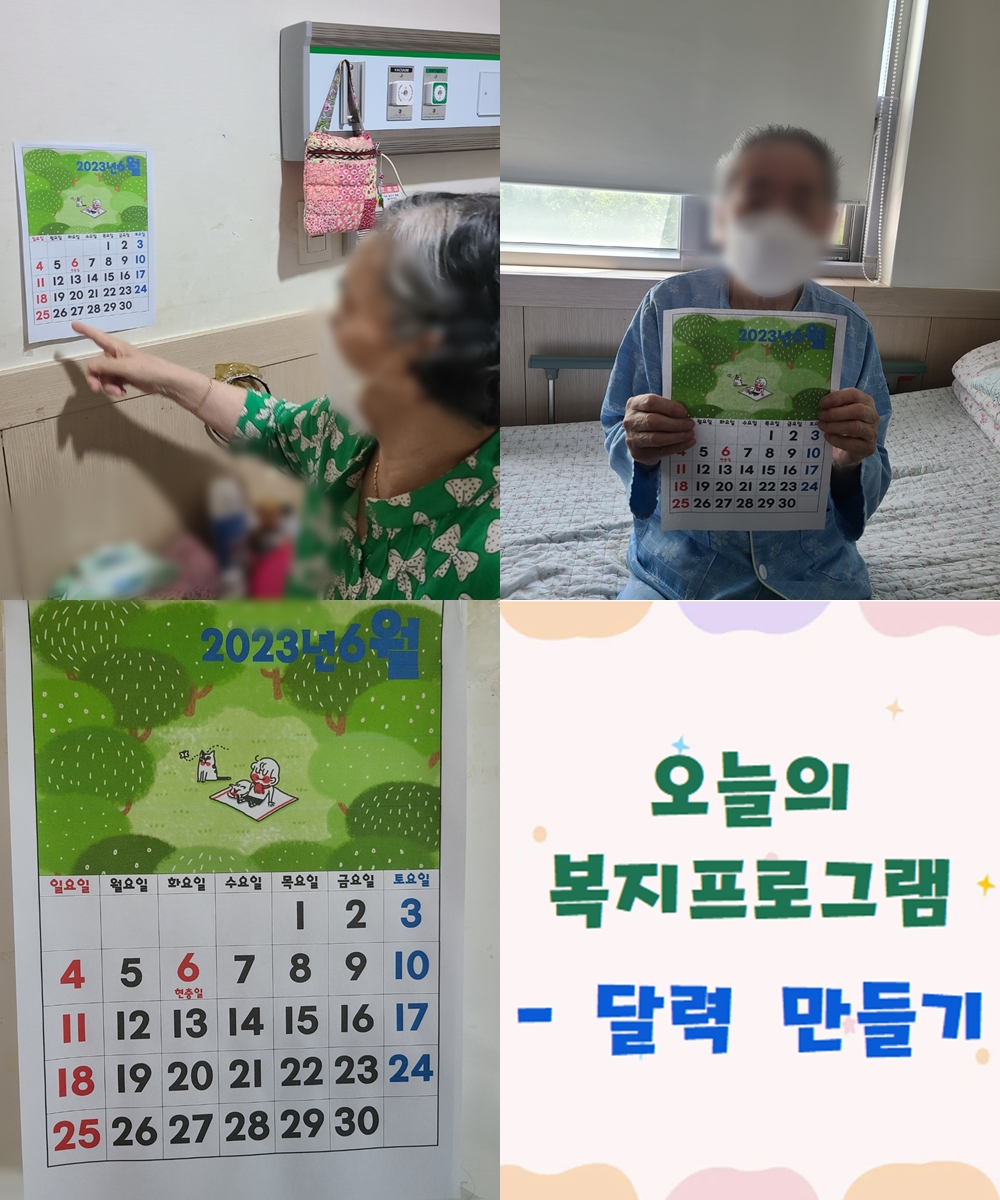 2023.06.01 인지치료 - 6월 달력 만들기 본문 2023년 06월 01일 (목) 오늘은 인지치료로 6월 달력 만들기를 하였습니다. 어르신들께서는 이제 곧 여름이 오는 것 같다고 하시며 시간이 정말 빠르다는 말씀을 하셨고, 달력 숫자조각을 붙이시며 꼼꼼하게 달력 만들기를 마무리 하셨습니다. 이전글 목록 다음글