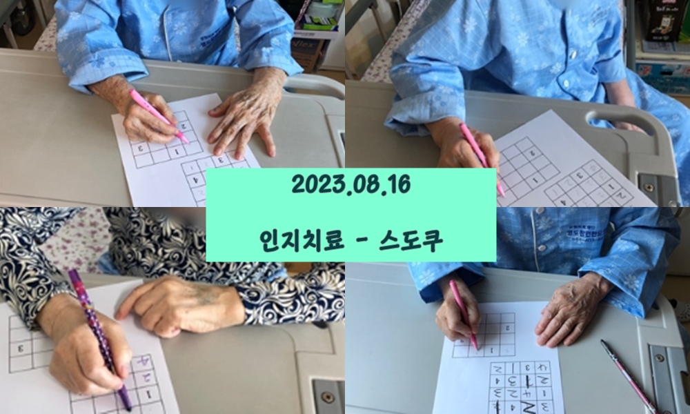 2023.08.16 인지치료 - 스도쿠 본문 2023년 08월 16일 오늘은 인지치료로 스도쿠를 하였습니다. 어르신들께서 오늘은 너무 어렵다 말씀하시며 힘들어하셨지만 새로운 것을 해본다며 좋아하기도 하셨습니다! 어렵지만 끝내 완성한 스도쿠를 보고 성취감을 느끼며 재미있게 하셨습니다~ 이전글 목록 다음글
