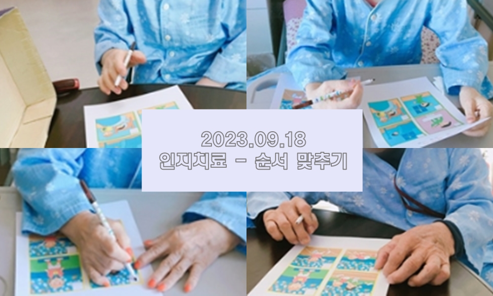 2023.09.18 인지치료 - 순서 맞추기 본문 2023년 09월 18일 (월) 오늘은 인지치료로 순서 맞추기를 하였습니다. 어르신들께서는 그림을 천천히 살펴보며 행동을 따라하기도 했고, 소리를 내며 정답을 맞춰 나가는 모습이 정말 열정적이셨습니다~! 이전글 목록 다음글