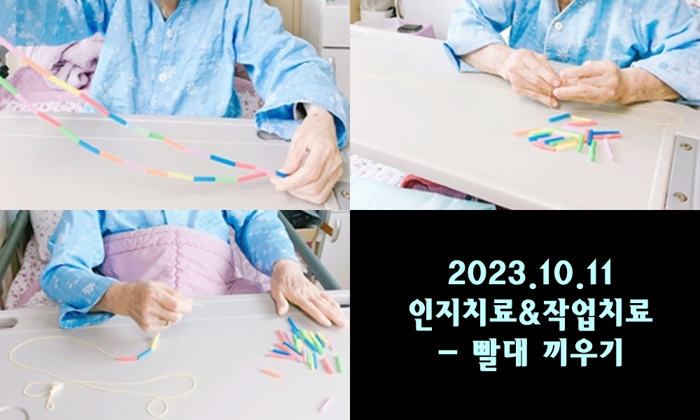 2023.10.11 인지치료&작업치료 - 빨대 끼우기 본문 2023년 10월 11일 (수) 오늘은 빨대 끼우기를 하였습니다. 색색의 빨대를 보고 색을 맞춰가며 차근차근 실에 끼우는 모습을 볼 수 있었습니다. 완성 후, 목에 걸고 "목걸이다!" 라고 말씀하시며 함박 웃음을 짓기도 했습니다! 이전글 목록 다음글