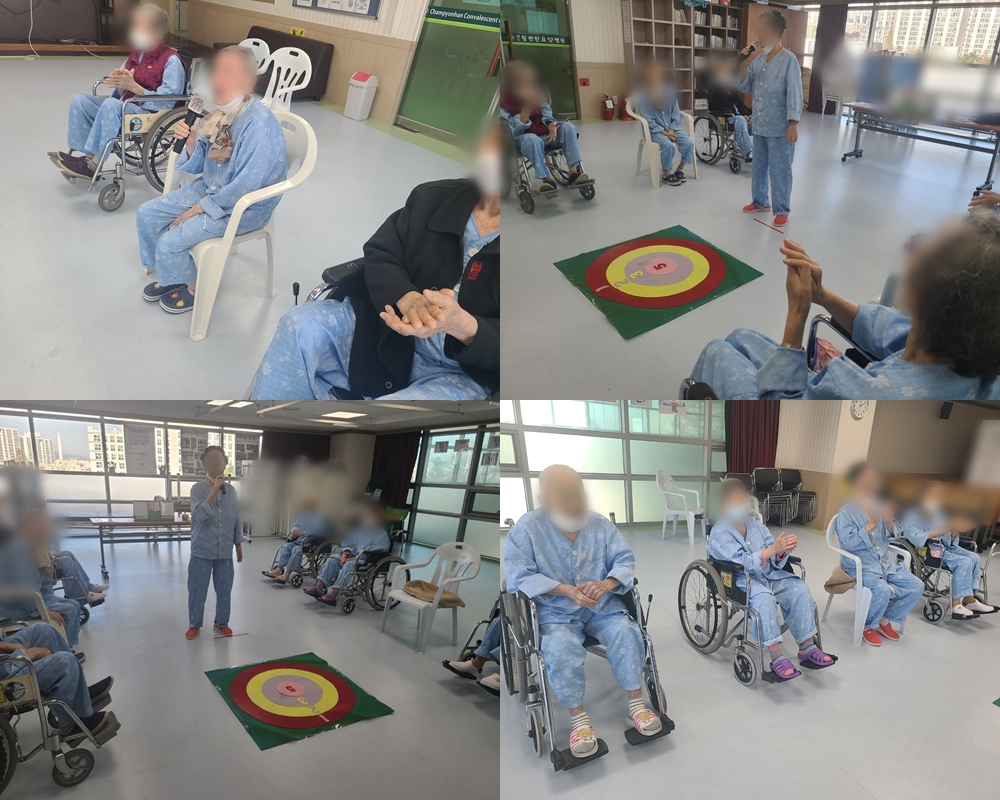 2023.11.02 치료레크리에이션 - 과녁맞추기 & 노래교실 본문 2023년 11월 02일 (목) 오늘도 치료레크리에이션 활동을 하였습니다. 게임을 마치신 후 막간의 시간을 활용하여 어르신들께서 좋아하는 노래를 부르며 노래교실 시간도 가졌습니다~^^ 어르신 한분께서는 흥이 난다고 하시며 직접 가운데로 걸어오셔서 마이크를 잡고 서서 우렁차게 노래를 부르셨습니다. 이전글 목록 다음글