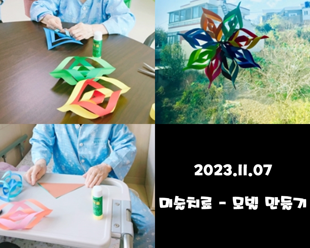 2023.11.07 미술치료 - 모빌 만들기 본문 2023년 11월 07일 (화) 오늘은 미술치료로 모빌 만들기를 하였습니다. 색색의 색종이를 골라 스스로 풀을 붙이고 종이를 오려가며 집중을 하셨고, 서로가 만든 작품이 하나로 합쳐지자 "방이 환해졌다" 라고 말씀하시며 행복한 미소를 보이셨습니다~! 이전글 목록 다음글