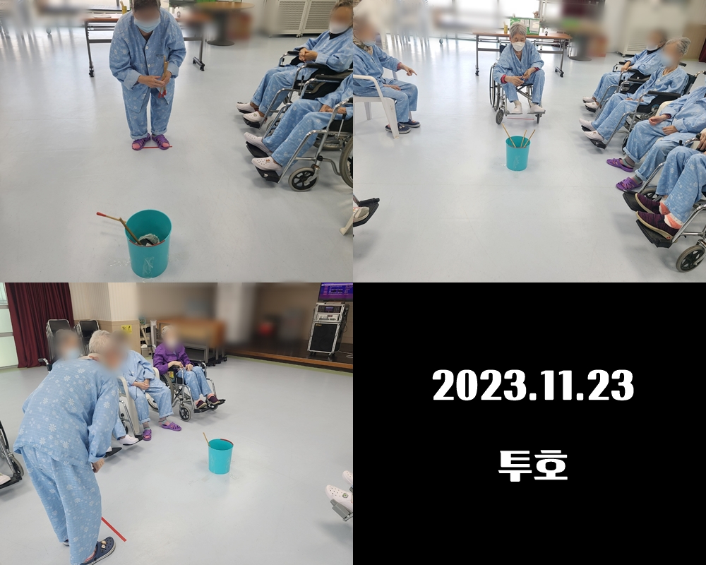 2023.11.23 치료레크리에이션 - 투호 본문 2023년 11월 23일 (목) 오늘은 치료레크리에이션으로 투호를 하였습니다. 팔이 긴 어르신께서는 아주 쉽게 막대기를 잘 던지셔서 만점을 거의 받자 다른 어르신들께서 박수를 치시며 축하해주셨습니다~^^ 이전글 목록 다음글