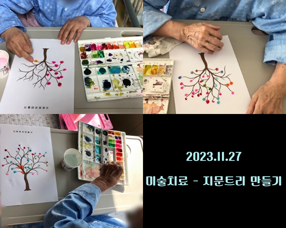 2023.11.27 미술치료 - 지문트리 만들기 본문 2023년 11월 27일 (월) 오늘은 미술치료로 지문 트리 만들기를 하였습니다. 손에 직접 물감을 묻혀 그림을 채워가는 것을 어르신들께 신기해 하셨고 도구가 아닌 손으로 하는 것이라 더 재미있어 하셨습니다. 이전글 목록 다음글