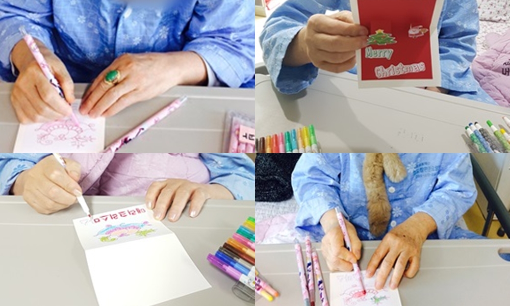 2023.12.12 미술치료 - 카드 만들기 본문 2023년 12월 12일 오늘은 미술치료로 크리스마스 카드 만들기를 하였습니다. 곧 다가올 크리스마스를 맞이하여 어르신들과 크리스마에 대해 이야기를 나누기도 하고. 예쁜 그림을 색칠도 하면서 아이처럼 들뜬 기분을 보이기도 하셨습니다^^ 이전글 목록 다음글