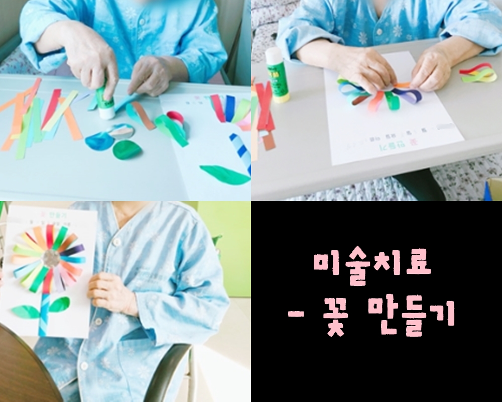 2024.02.06 미술치료 - 꽃 만들기 본문 2024년 2월 6일 (화) 오늘은 미술치료로 꽃 만들기를 하였습니다. 참여자들은 알록달록한 색종이를 여러개 돌돌 말아 꽃 모양을 완성시켜 나갔고, 흡족한 표정으로 자신의 작품을 자랑하며 즐겁게 마무리 되었습니다~! 이전글 목록 다음글