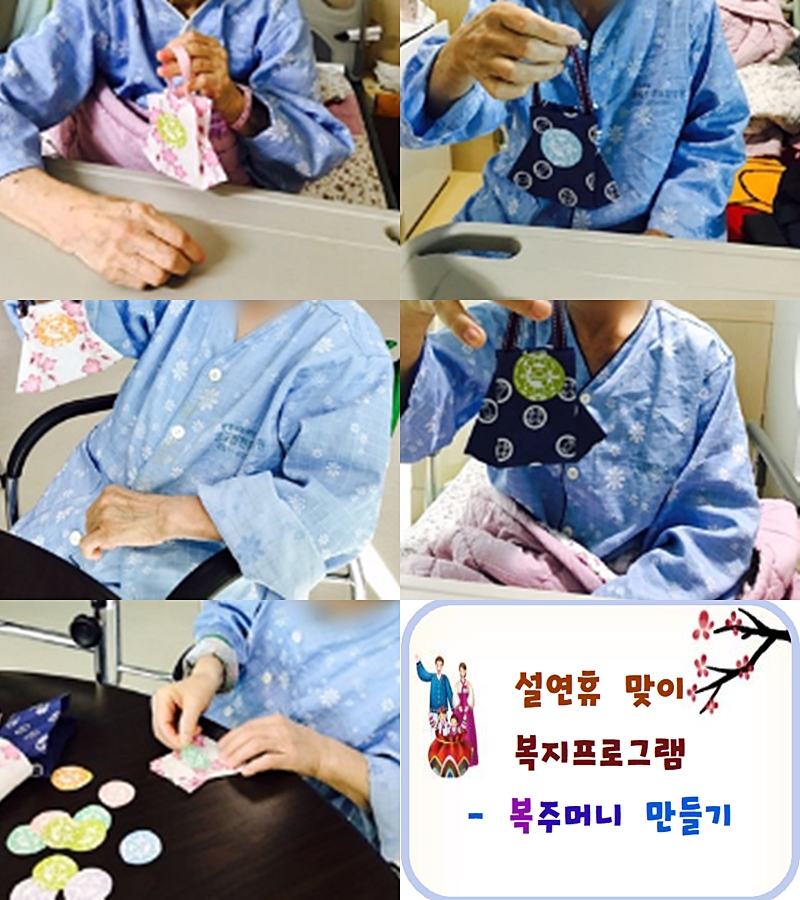2024.02.08 미술치료&작업치료 - 복주머니 만들기 본문 2024년 02월 08일 (목) 오늘은 미술치료&작업치료로 복주머니 만들기를 하였습니다. 완성한 복주머니를 가방처럼 들고 다니시면서 새해 용돈을 받아야겠다며 농담을 하셨습니다^^ 이전글 목록 다음글