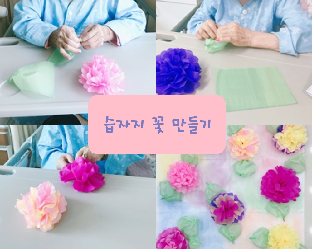 2024.05.07 미술치료 - 습자지 꽃 만들기 본문 2024년 05월 07일 (화) 오늘은 미술치료로 습자지 꽃 만들기를 하였습니다. 다양한 색깔의 습자지를 이용하여 꽃을 표현하자 "어버이 날을 맞이 하네"라고 하시며 예쁜 꽃이 완성 될 수 있도록 집중하는 모습을 보이셨습니다^^ 이전글 목록 다음글
