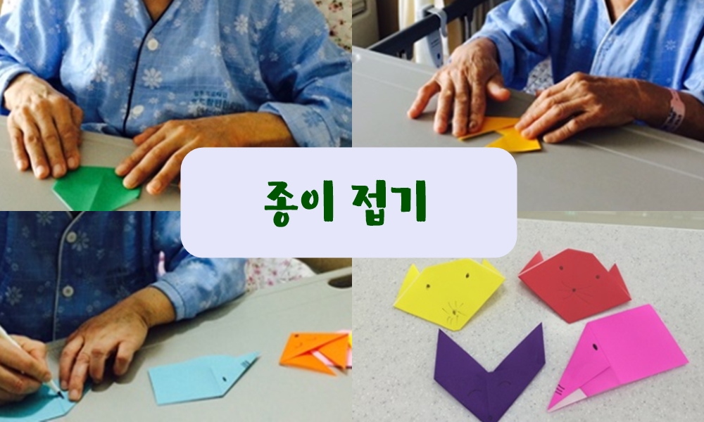 2024.06.04 미술치료&작업치료 - 종이접기 본문 2024년 06월 04일 오늘은 종이접기를 하였습니다~여러가지 동물 모양으로 간단하게 종이접기를 했더니 어르신들께서는 귀엽다며 참 좋아하셨습니다^^ 이전글 목록 다음글