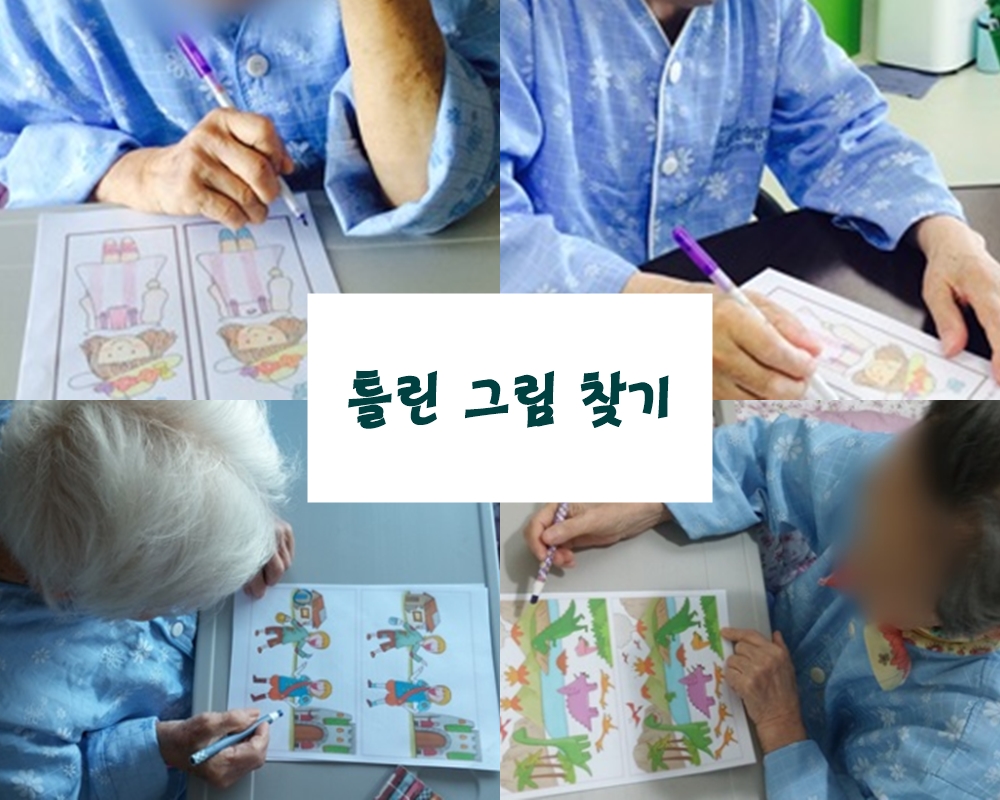 2024.08.13 인지치료 - 틀린 그림 찾기 본문 2024년 08월 13일 (화) 오늘은 인지치료로 틀린 그림 찾기를 하였습니다. 틀린 부분을 찾기가 생각보다 어렵다고 하셨지만어르신들 모두 두 눈을 크게 뜨시고 집중하는 모습을 보여주셨습니다~! 이전글 목록 다음글