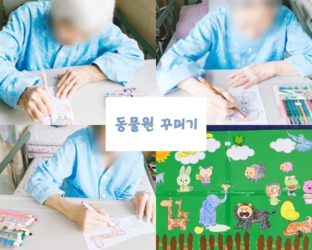 2024.08.26 미술치료 - 동물원 꾸미기 본문 2024년 08월 26일 (월) 오늘은 미술치료로 동물원 꾸미기를 하였습니다.다양한 동물들을 보며 이름을 맞추기도 하고 즐겁게 색칠을 하고,서로 협동을 통해 완성된 그림을 보시며 연신 웃음을 머금고 계셨습니다! 이전글 목록 다음글
