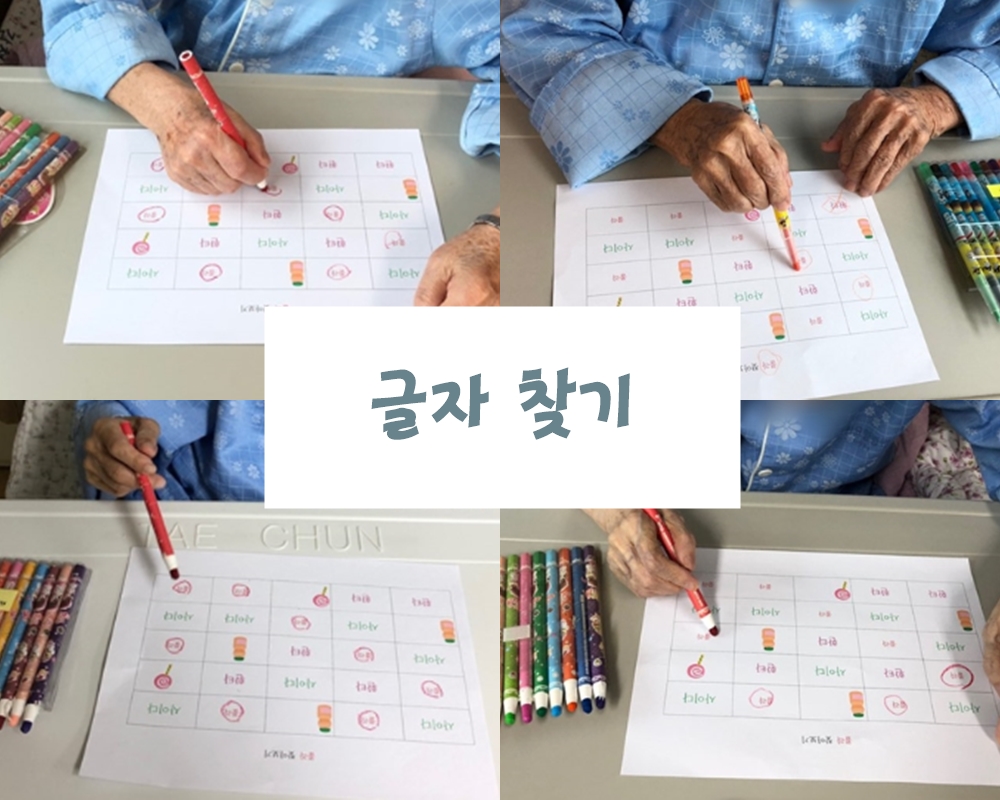 2024.09.30 인지치료 - 글자 찾기 본문 2024년 09월 30일 (월) 오늘은 인지치료로 글자찾기를 하였습니다. 알록달록 다양한 색깔과 그림이 있는 자료를 보고 예쁘다고 좋아하셨고, 쉽게 찾아야하는 글자를 잘 찾으며 재미있게 하셨습니다 !! 이전글 목록 다음글