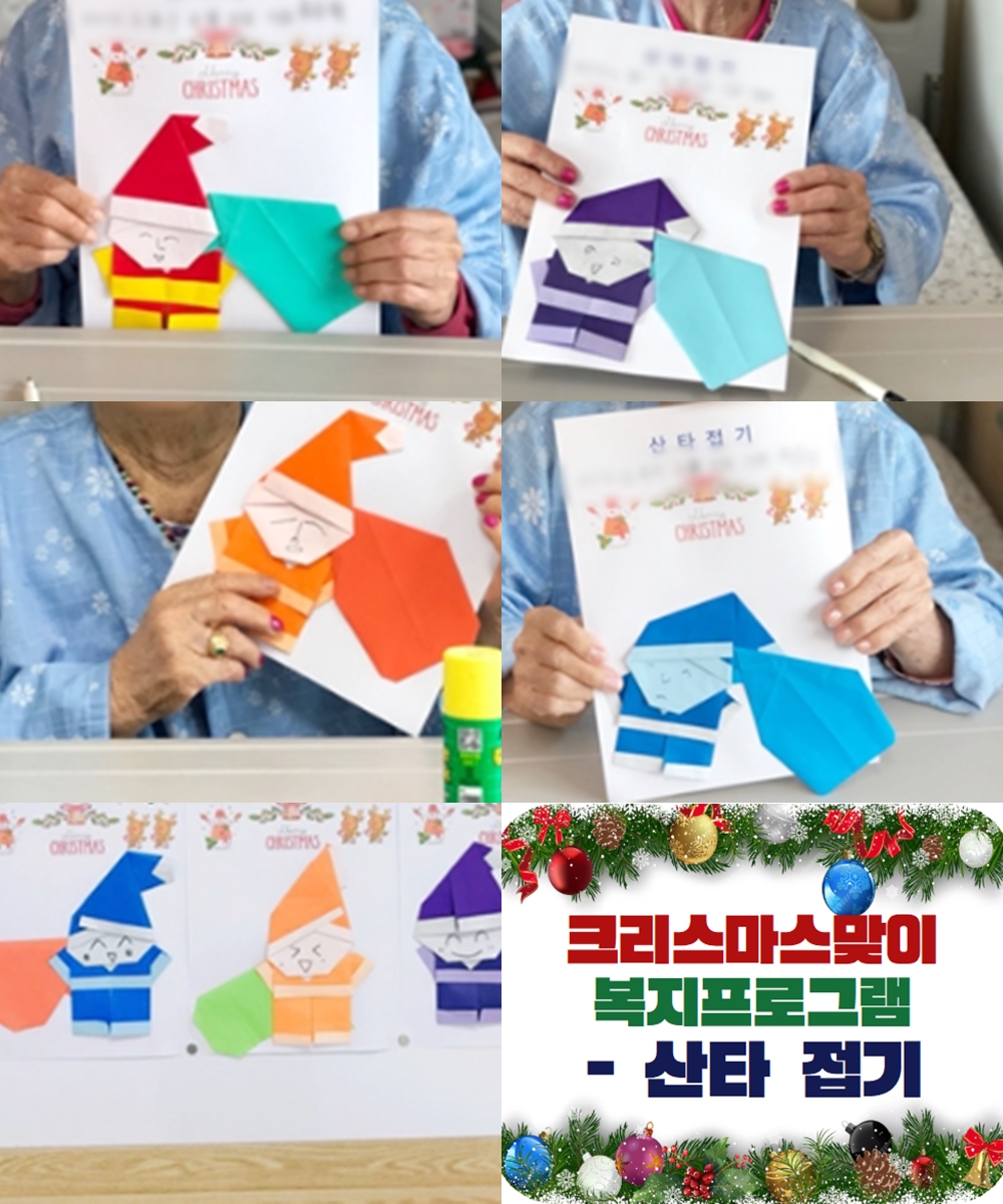 2024.12.23 미술치료&작업치료 - 산타 접기 본문 2024년 12월 23일 (월) 오늘은 미술치료 및 작업치료로 다가올 크리스마스를 맞이해 산타 접기를 하였습니다. 방법을 보시고 천천히 따라 접으셨고 모양이 완성될 때 마다 신기해 하셨으며, 완성된 산타를 보고 "사람 한 명 만들었다!" 라고 말씀하시며 즐거워 하셨습니다~! 이전글 목록 다음글