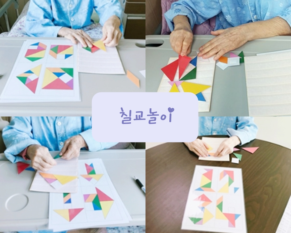 2025.03.20 인지치료 - 칠교놀이 본문 2025년 3월 20일 (목) 오늘은 인지치료로 칠교놀이를 하였습니다.도안을 보고 도형을 이리저리 돌려가며 정답을 맞추기 위해 노력하셨으며,완성된 칠교를 보고 박수를 치며 즐거워 했습니다~ 이전글 목록 다음글