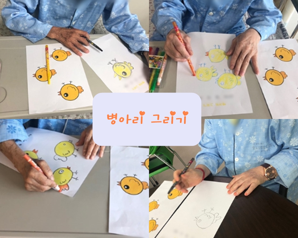 2025.04.21 미술치료 - 병아리 그리기 본문 2025년 04월 21일 (월) 오늘은 미술치료로 병아리 그리기를 하였습니다. 어르신들께서 병아리를 그리는 것이 은근 쉽지 않다며 주저하는 모습을 많이 보이셨지만 진행자와 천천히 그려보며 함께하니 흥미를 가지고 재미있게 하셨습니다 ~ 이전글 목록 다음글