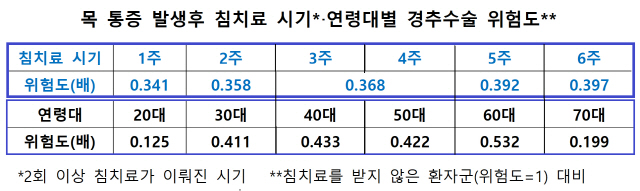 목 통증 발생 6주 안에 2회 이상 침치료를 받은 환자군의 경추수술 위험도는 대조군의 0.397배였다. 특히 단기간에 2회 이상 침치료를 할수록 경추수술 위험도가 낮았다. 1주일에 2회 이상 침치료를 받은 환자군의 수술 위험도는 대조군의 0.341배, 2주 0.358배, 3주와 4주 0.368배, 5주 0.392배였다.