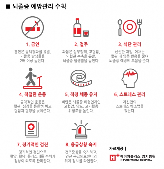 에이치플러스(H+) 양지병원 신경과 강석재 과장은 “뇌졸중은 사망률이 높고 생존해도 신체마비, 의식장애 등 후유증이 남을 수 있어서 평소 혈관관리에 신경을 써야 한다.” 라며 “고혈압, 당뇨 등 만성질환이나 가족력이 있는 환자들은 더욱 주의해야 한다” 고 전했다.