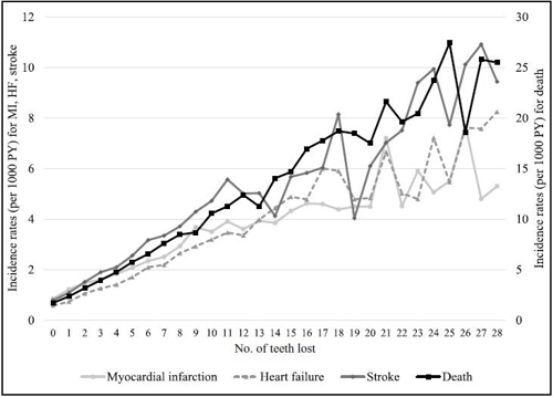 논문을 보면 심혈관계질환과 사망자 발생 모두 치아 상실 개수에 비례해 증가하는 양상을 보였다. 이들 질환에 영향을 미치는 성별, 나이, 기저질환, 음주, 흡연, 소득 수준을 보정해도 치아 상실은 심혈관계질환에 영향을 미치는 주요 요인이었다.