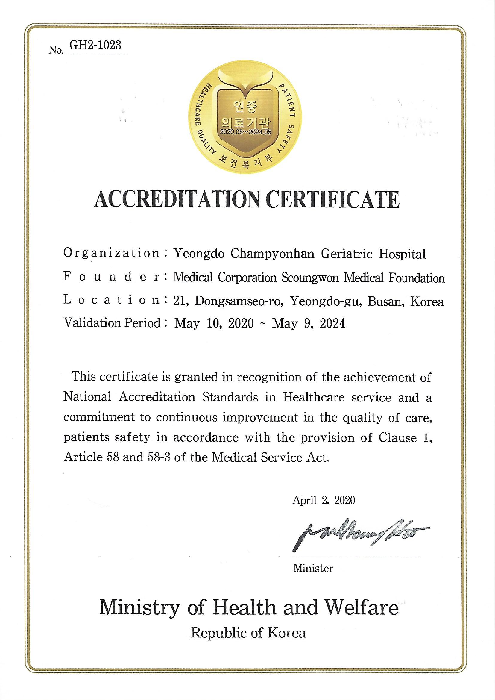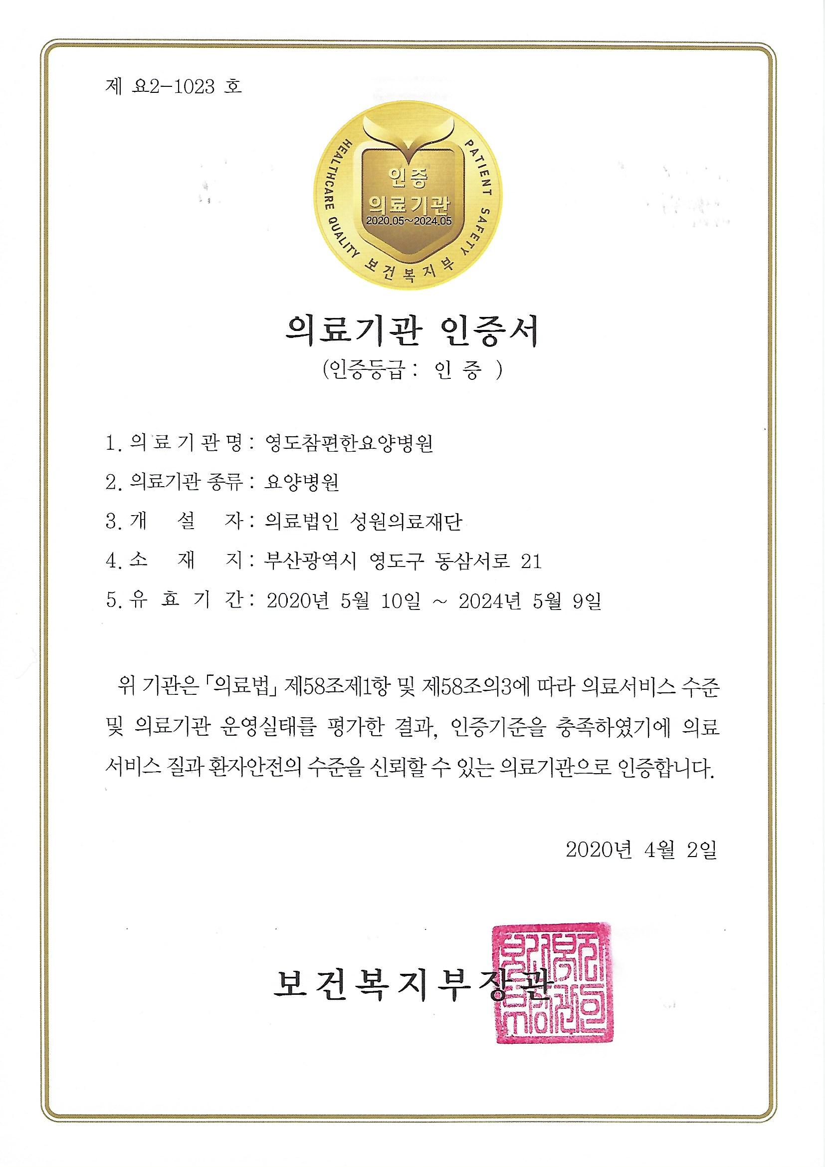 영도참편한 요양병원 인증평가를 통과하여 보건복지부의료기관 인증을 획득하였습니다.