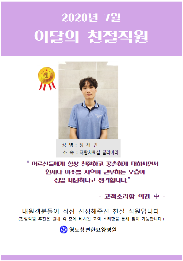[안내] 2020년 7월 친절직원 선정 본문 우리 병원에서는 원내 각 층에 비치되어 있는 고객소리함을 통해 매달 친절 직원을 선정하고 있습니다. 최상의 의료서비스를 제공하기 위해 더욱 더 노력하는 영도참편한요양병원 직원들이 되겠습니다. 이전글 목록 다음글